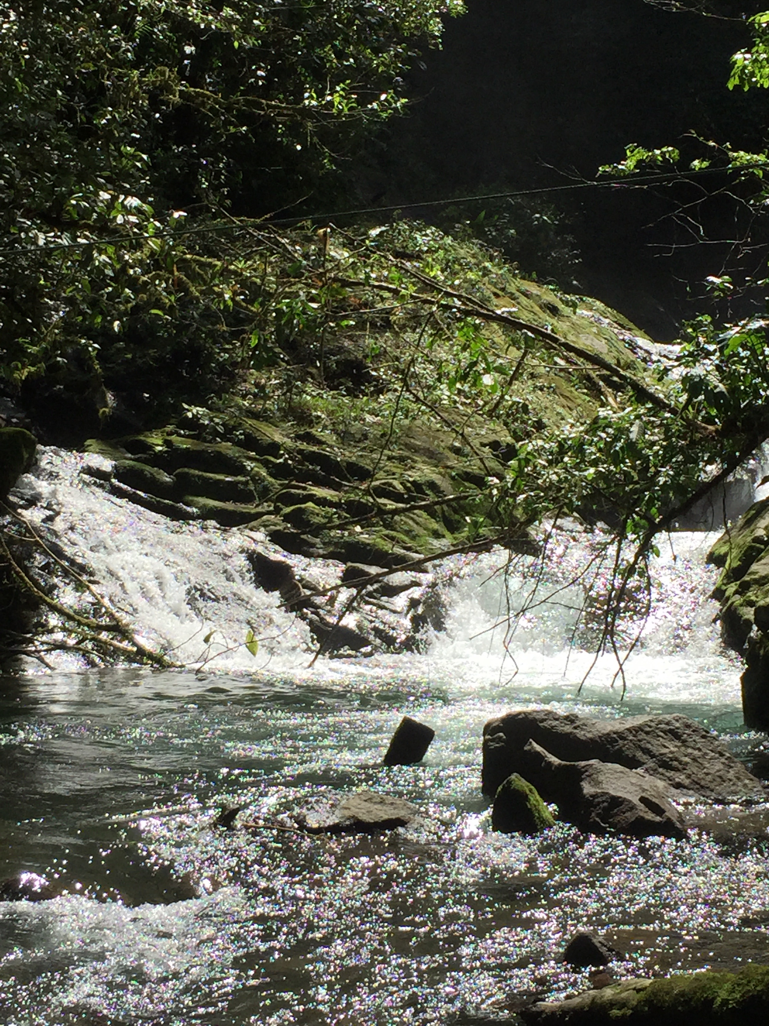 Undaunted we carried on and eventually arrived at a point where we had to cross the river on foot. Exciting! It was quite deep and flowing very quickly. We had two ropes to hang on to as we sidled across. No mishaps – phew!