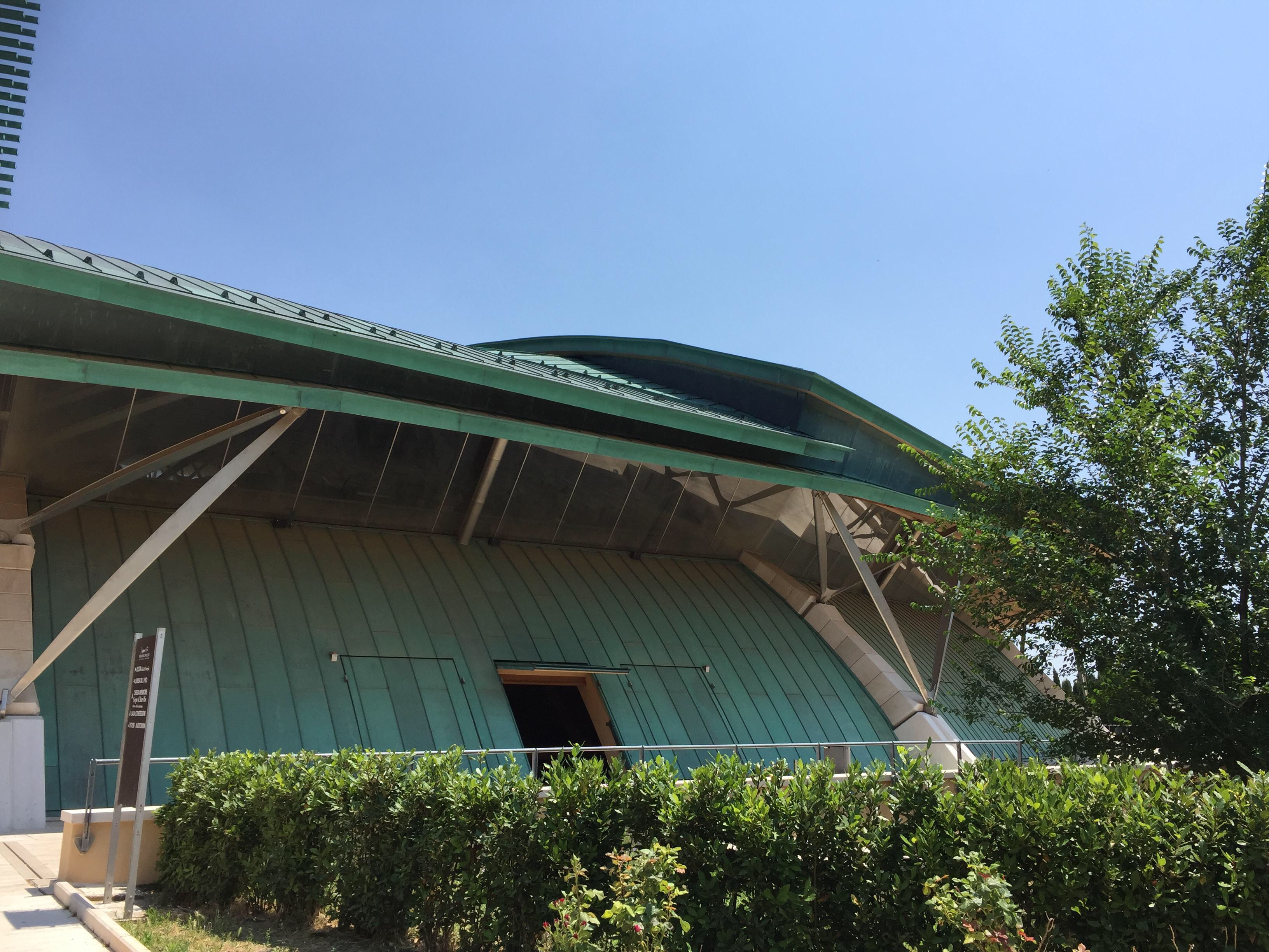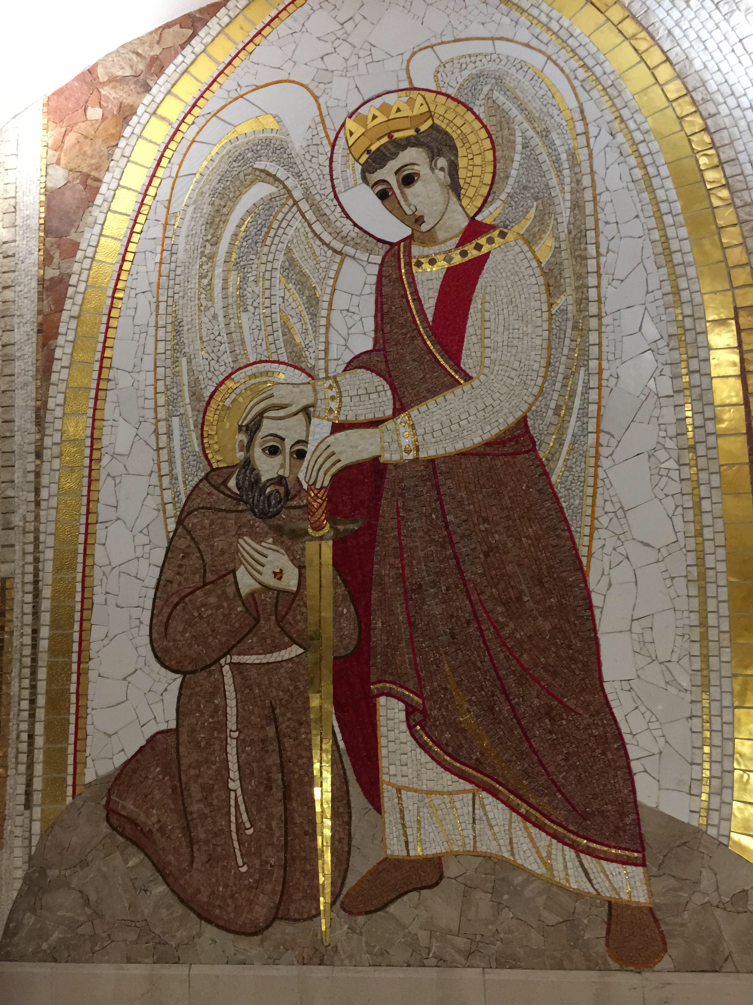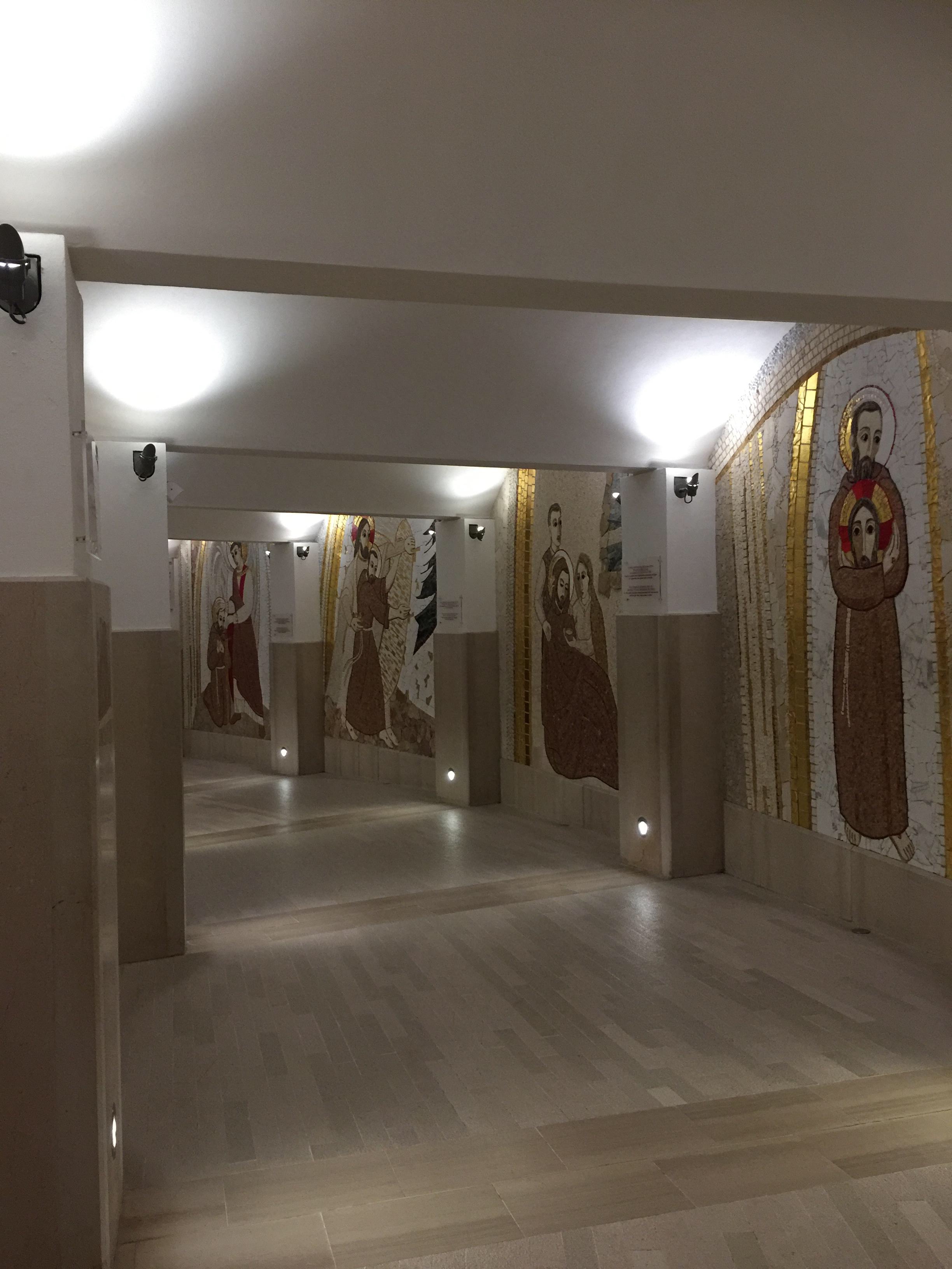 It’s a bit like a spaceship. It has doors around it that slide up, suspended arches inside the church and modern catacombs that are decorated with the most sublime mosaics. The pews are made from chunky, smooth pieces of wood, no screws, they just fit together perfectly.