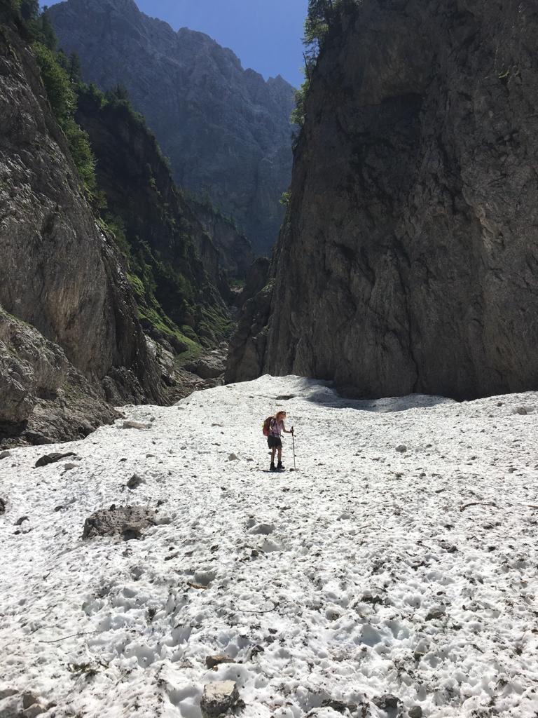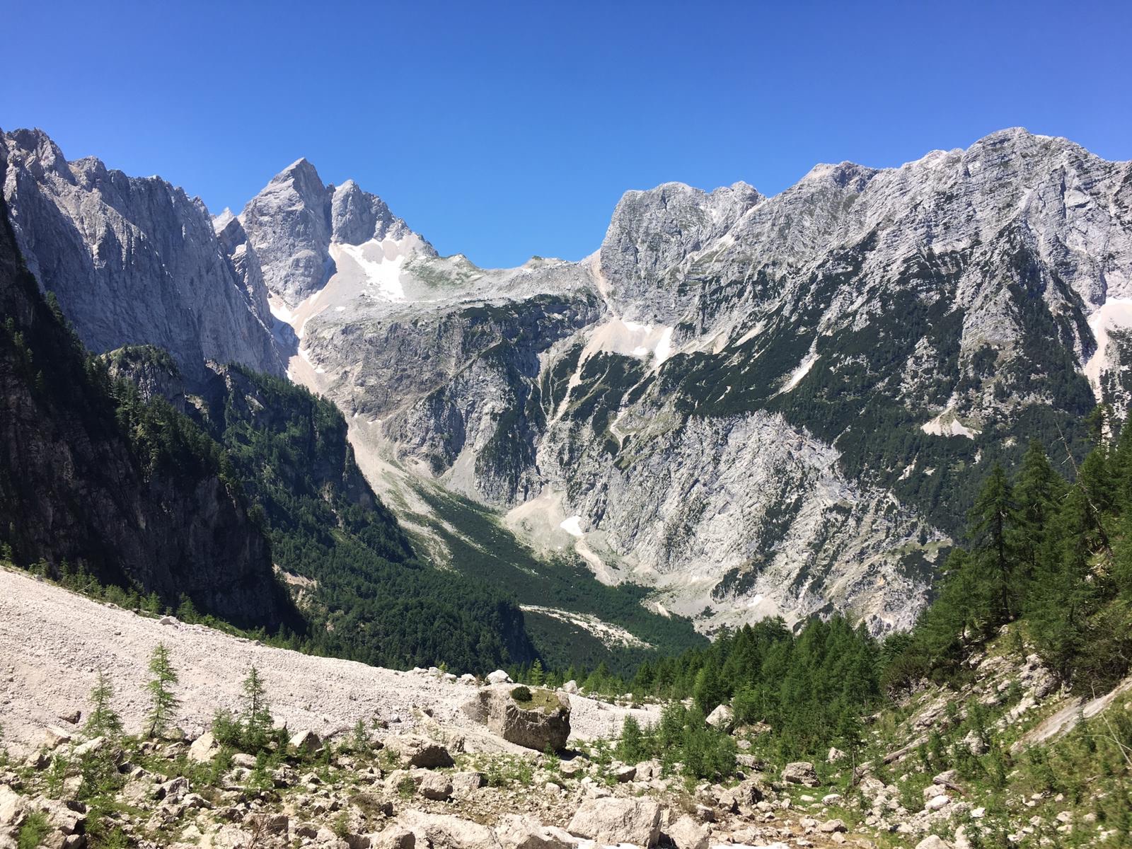 The hardest bit of the walk was the descent into the Planica Valley. The path was steep and full of loose stones. We kept stumbling all over the place and it was very tiring trying to keep upright. As we got to the point where we could see the valley, we realised we had to cross an extensive snow field. Not what you want to do on tired legs and no spikes. Anyway we made it but by the time we got back we couldn’t wait to get our boots off.