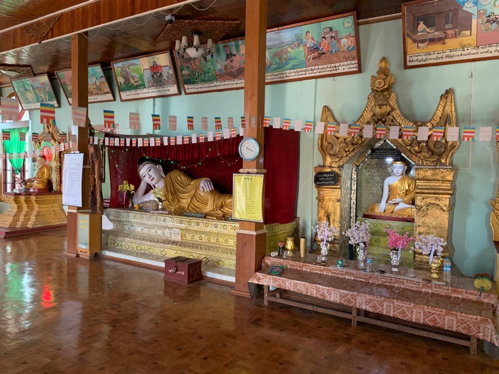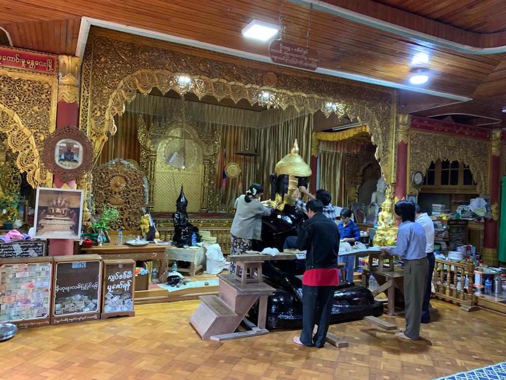 We arrived at the bamboo pagoda to find the locals covering a Buddha figure in gold leaf. I think this is quite the thing in Myanmar. I guess the purchasing of the gold leaf squares is a money maker for the monastery.