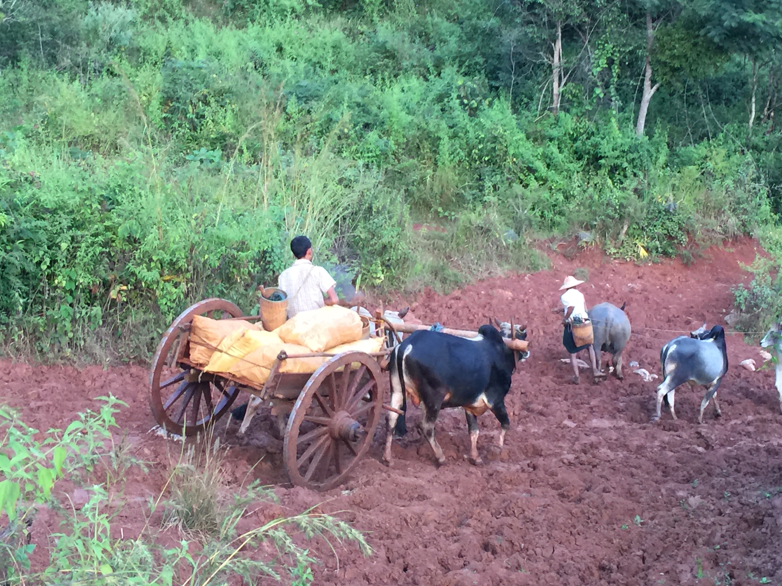 Home time was particularly fascinating. Just before dusk it was like rush hour, with ladies carrying baskets of produce on their heads or pulling along cows and men driving carts pulled by buffaloes along the mud “road”.