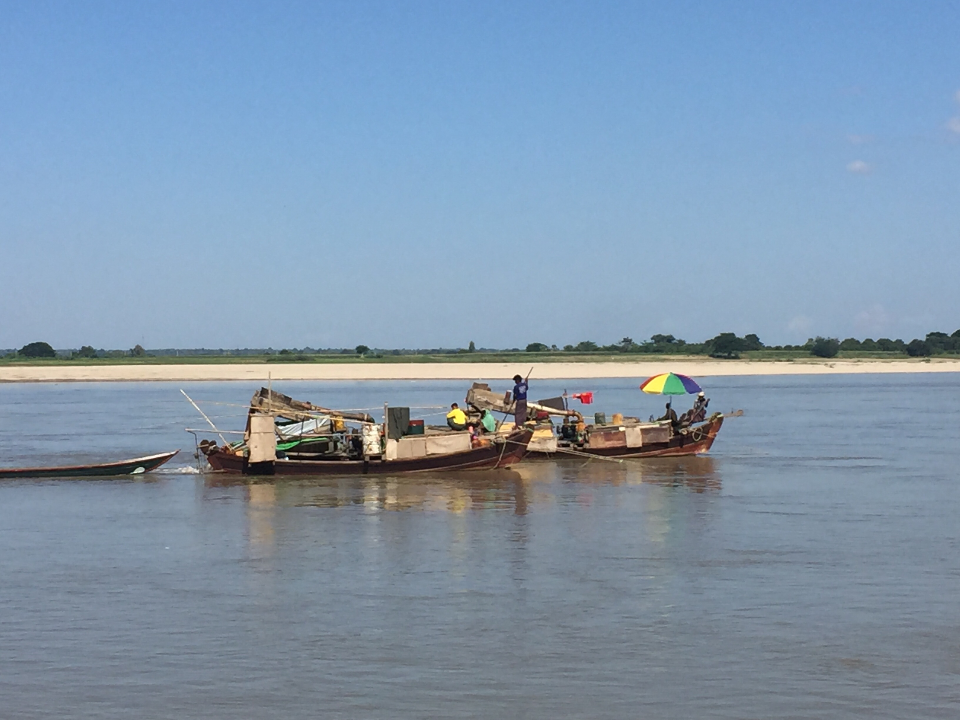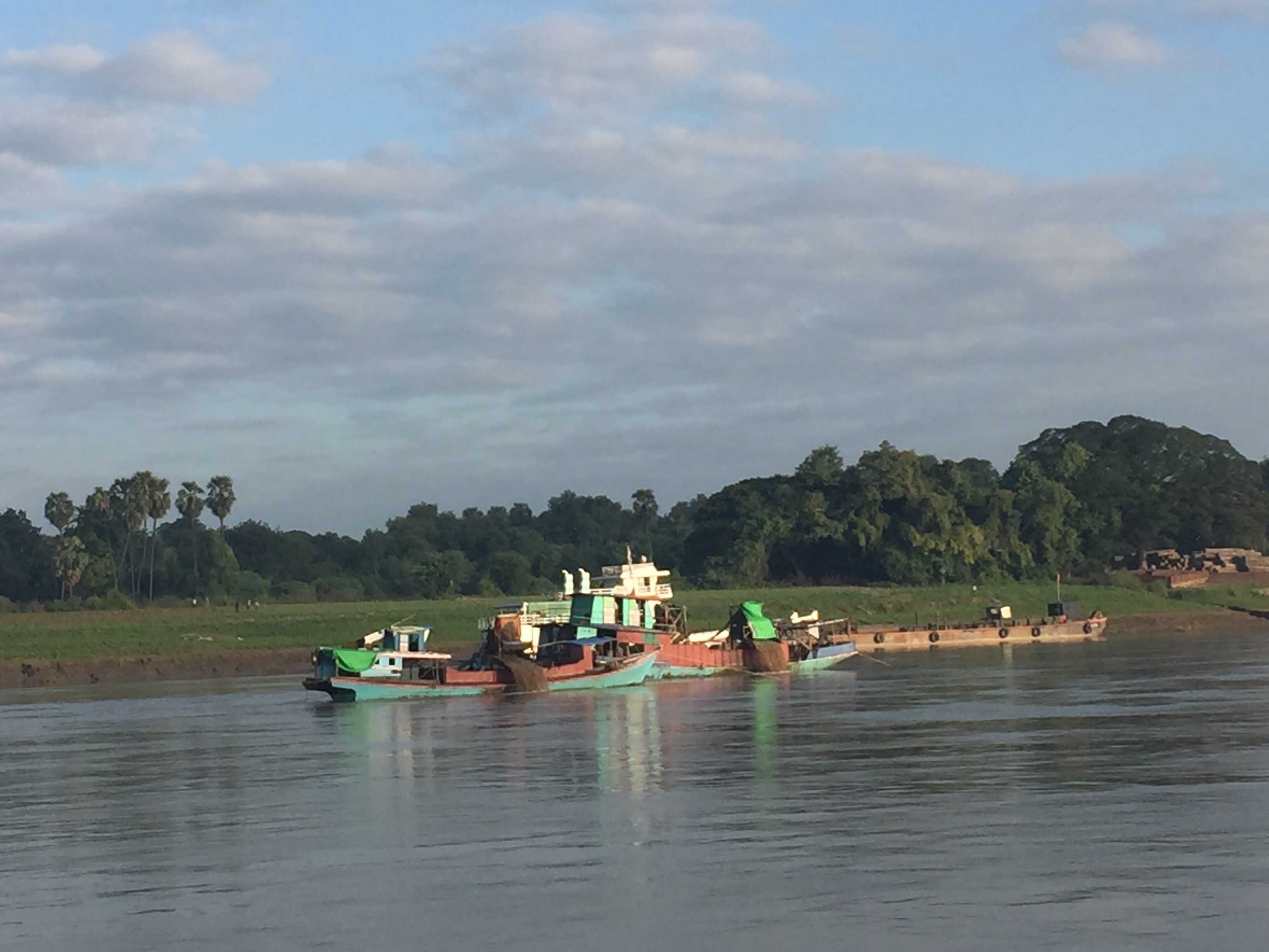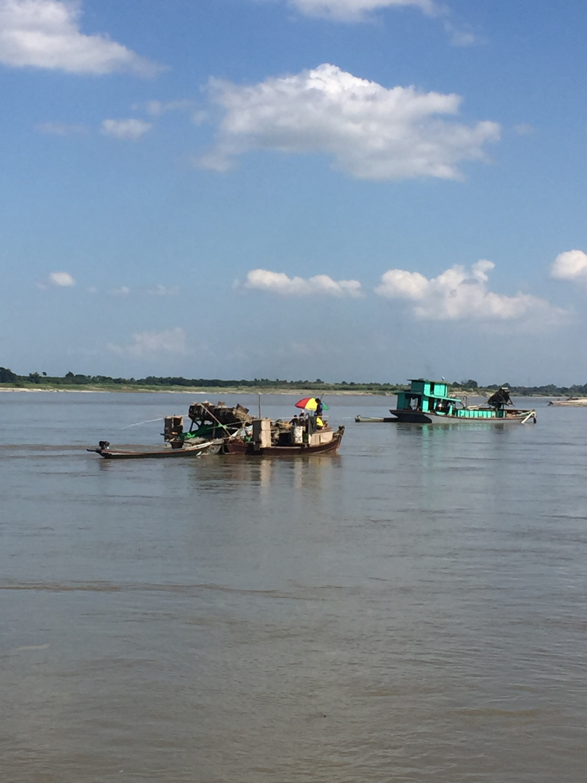 The river banks were lightly scattered with small villages where people were fishing,washing and generally enjoying the river. However further along we saw clusters of boats dredging and sifting for gold. The gold is used for gold leaf on Buddha statues but it does have a negative environmental impact on the river as does sand dredging.