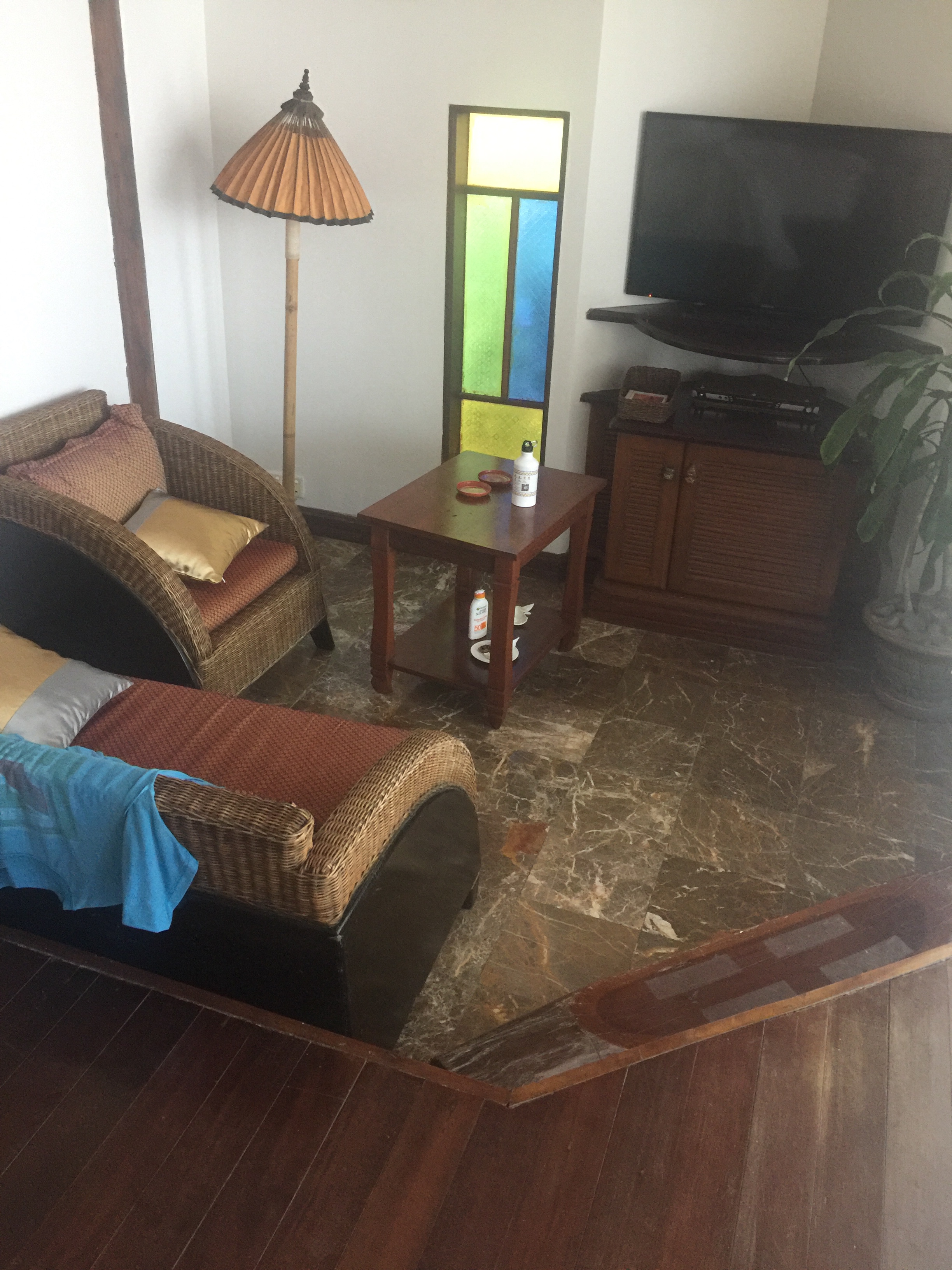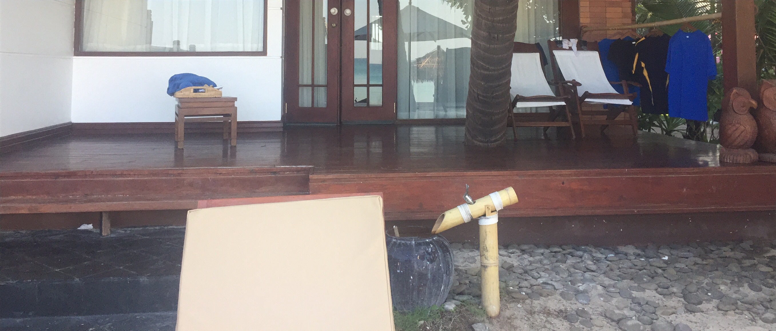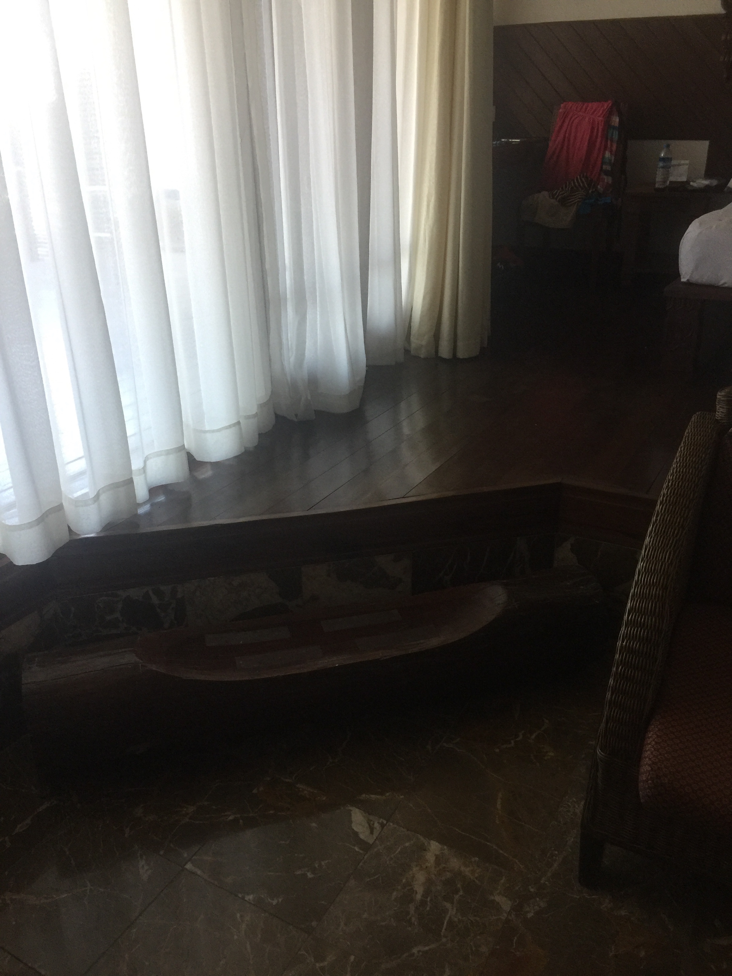 Now our sea front bungalow is split level. The sleeping area and the seating area are separated by a big drop, which you access via a step which is basically a polished tree trunk . I think Steve’s first words on seeing it was “that’s a bit dangerous”. Yes indeed it is Steve. Really we should have stayed in our hovel room which at least was all one level or I should have built a barricade around it, as you do for small children. After all these years I should know that if there is an accident to be had, Steve’s your man.