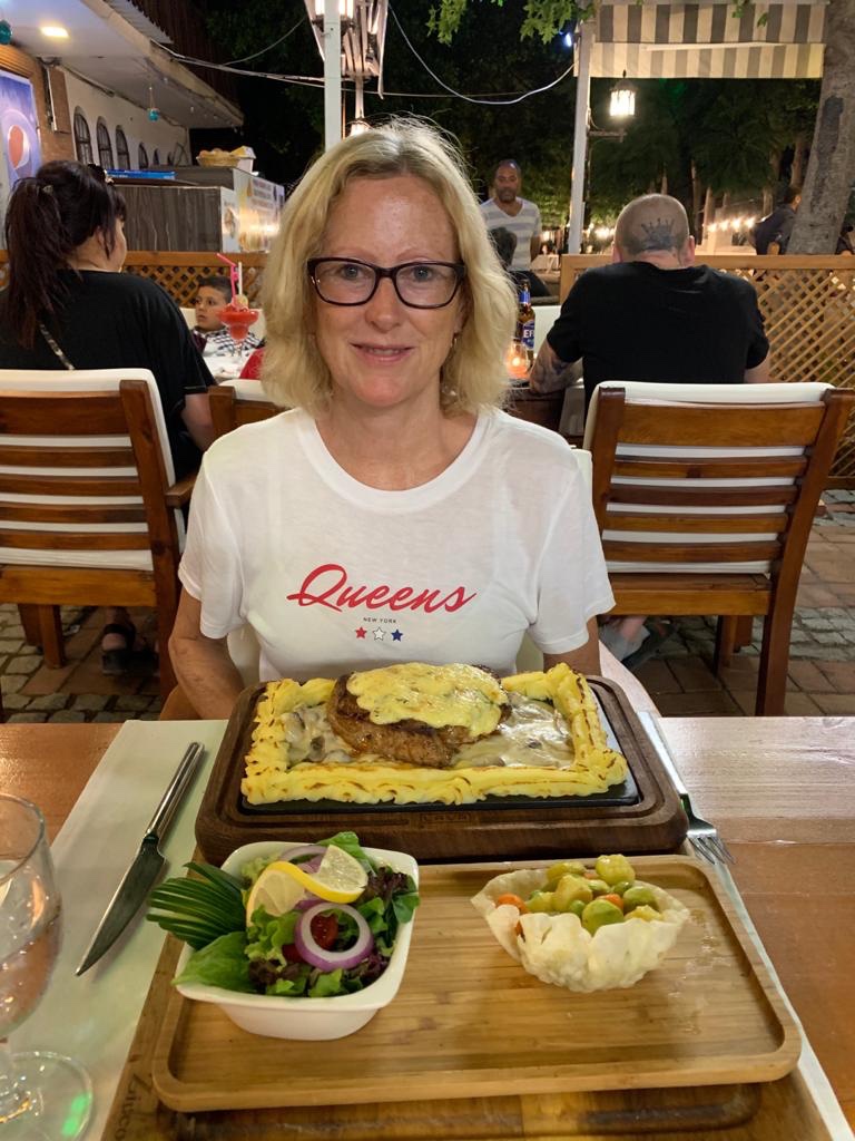 The joy of staying in Dalyan instead of Dalaman is that we have many restaurants in walking distance. Dalaman is not a hotbed of cutting edge cuisine by any means and Dalyan has something for everyone. We ate at the Carretta restaurant which was not in the fanciest location being near the mosque rather than the river, but the food was amazing. We both had steaks, Steve’s with a blue cheese sauce and mine with bearnaise sauce. They were sooo tender. A complete contrast to the “French” restaurant we went to in Bakewell a week ago where the steak should have been saved for a casserole.