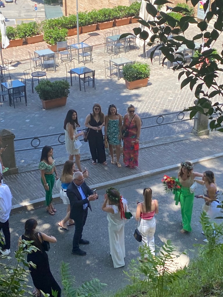 Tradition dictates the wearing of a wreath once you have graduated and the girls looked gorgeous in theirs, along with their stylish outfits of course. Families followed them around Urbino, filling up glasses of wine on the hoof. There was much singing and rowdiness until they all disappeared around 1pm, either for a snooze or a massive meal.
