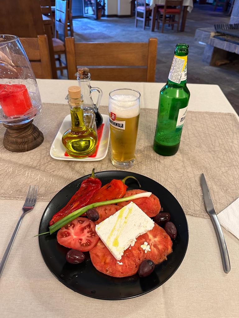 Dinner was a pleasant surprise. Mozzarella salad Bulgarian style (sheep’s cheese) followed by a big plate of meat and finished off with a delicious chocolate and pistachio slice of gateau resulted in Steve’s undying loyalty to this hotel, even if there were flamenco dancers clacking away all night on our villa roof.