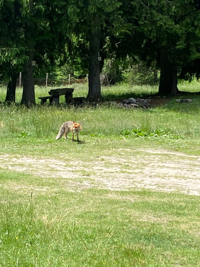 On our way back, we spotted a couple sitting outside their camper van, feeding a fox. Without even looking at their number plate, I knew they must be Brits and we passed the time of day as they opened a huge bag of doggy treats and indulged the vixen who must surely have thought she’d died and gone to heaven.