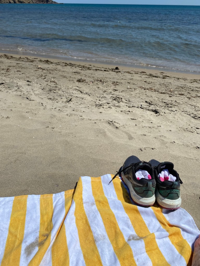 Back to the house for lunch and then off to Beach Genovese which we walked to. It’s a glorious beach with hardly anyone on it. A few nudists here and there and a couple of young families but otherwise ridiculously quiet. It was hot enough for a swim and although the water wasn’t much above the 14 degrees I quoted earlier in the blog, even S managed a dip – twice.