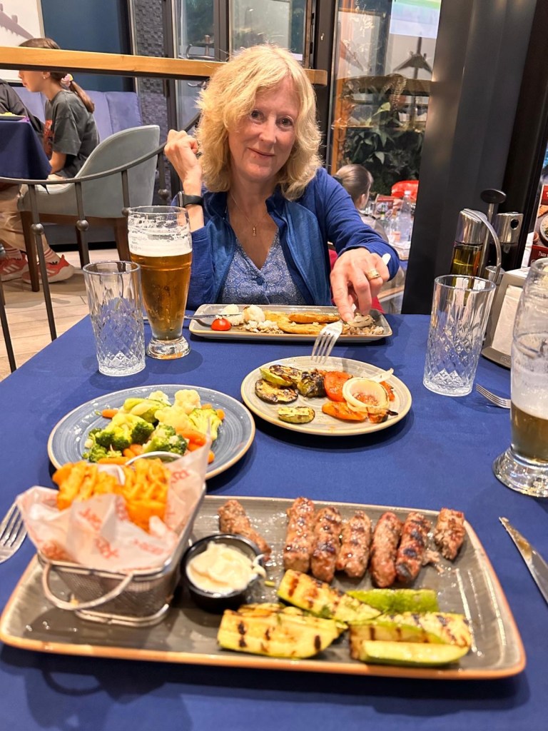 Dinner was at The Riviera Restaurant less than 10 mins walk away. It was very cozy and a good atmosphere. Multigenerational families eating together, friends all very local. Made me miss family. Food was good too and great value. S booked again for tomorrow!
