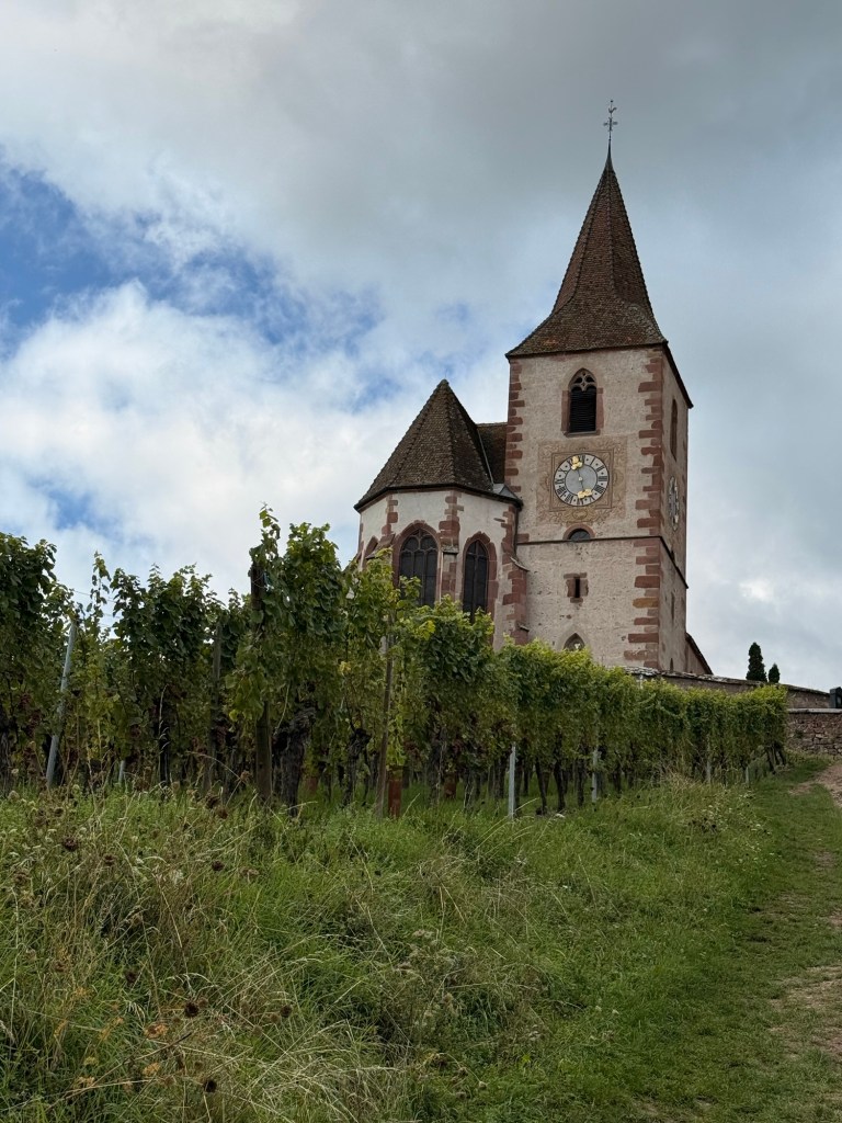 Our first stop was at a little village called Hunawihr. It was very quiet but inhabited and it was nice to see the little children coming out of school for lunch. We had to climb up a steepish hill to see the church and from there we could admire the view. The Alsace towns and villages that have been preserved all have beamed and painted houses. A feast for the eye.