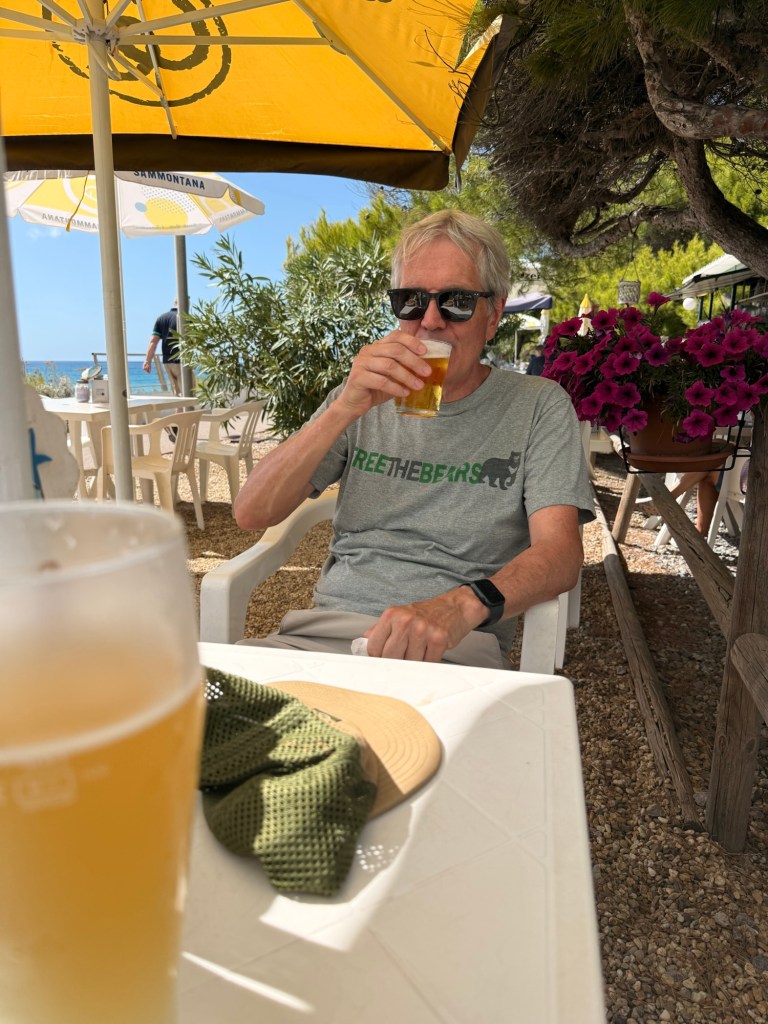 The route hugs the coast so you have a fabulous view of the sea. We drank it in until we actually needed a drink, and then we stopped for a refreshing cold beer. Shandy in my case and a very alcohol heavy beer for S – he hadn’t realised quite how strong it was (almost 8%) but on the plus side, after a swim in the sea he had a nice power snooze on the beach.