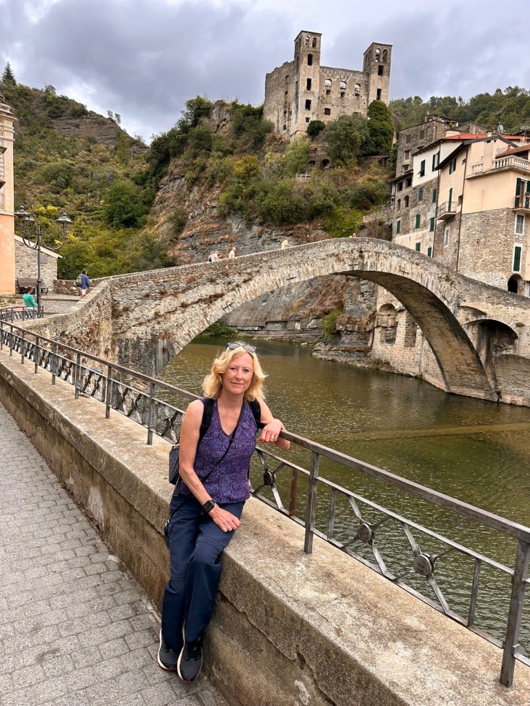 First on the agenda was a visit to the medieval village of Dolceacqua, an hour’s drive from Imperia. It appeared that everyone else had the same idea so parking was not easy to find. However, Steve had employed his Italian persona and not only did he ignore the no entry sign to the car park and nab the last space, he did it just as a poliziotto turned his back. Ben fatto!